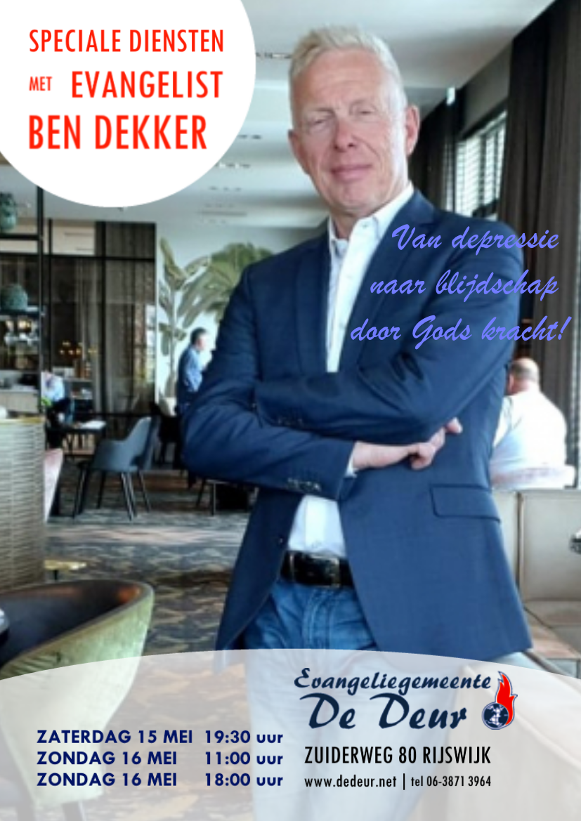 Komend weekend hebben wij speciale kerkdiensten met evangelist Ben Dekker. Recent vertelde hij over zijn leven in het televisieinterview dat onderaan dit bericht staat. En vanaf zaterdag 15 mei 19:30 uur is hij bij ons voor de eerste van een drietal diensten. De andere diensten zijn op zondag om 11:00 uur en 18:00 uur.